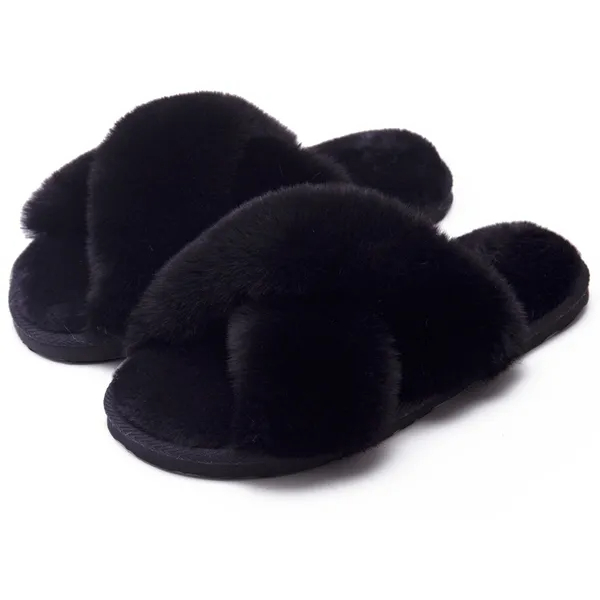 Stay comfy in this updated classic. The crisscross bands of plush; luxurious; fully lined faux fur will cradle your toes in comfort. The slip-on design will have you on your way in style and the flexible; anti-skid sole will ease your step as you go!